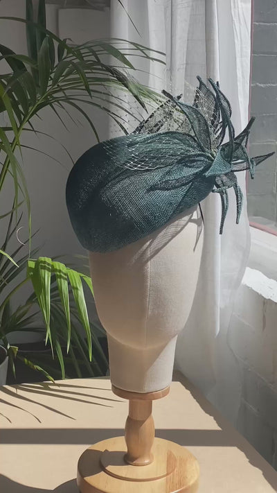 Handcrafted from cool green sinamay, this elegant fascinator is crowned with sculpted leaf-like details and a soft green veil. A striking yet graceful piece, perfect for weddings, race days, or any occasion where timeless style is celebrated.